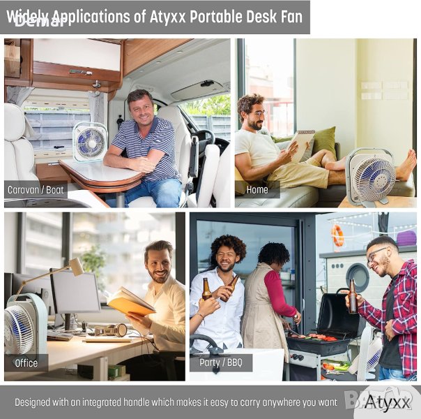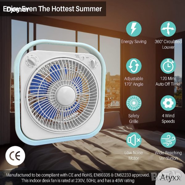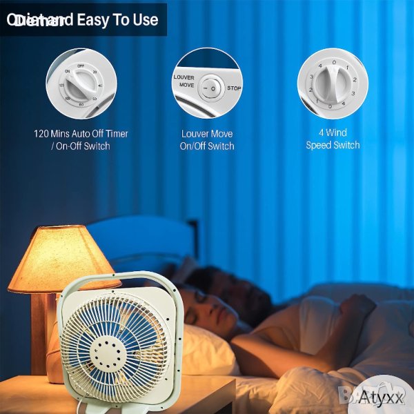 Мощен 45W преносим настолен вентилатор, освежаващ въздушен поток с диаметър 10", 360° циркулираща жалуза с регулируеми 170° нагоре и надолу, за да отговори на вашите нужди под различни ъгли, ускорете охлаждането на температурата и циркулацията на въздуха на закрито. 120 минутен таймер с автоматичното изключване позволява пестене на енергия след заспиване.