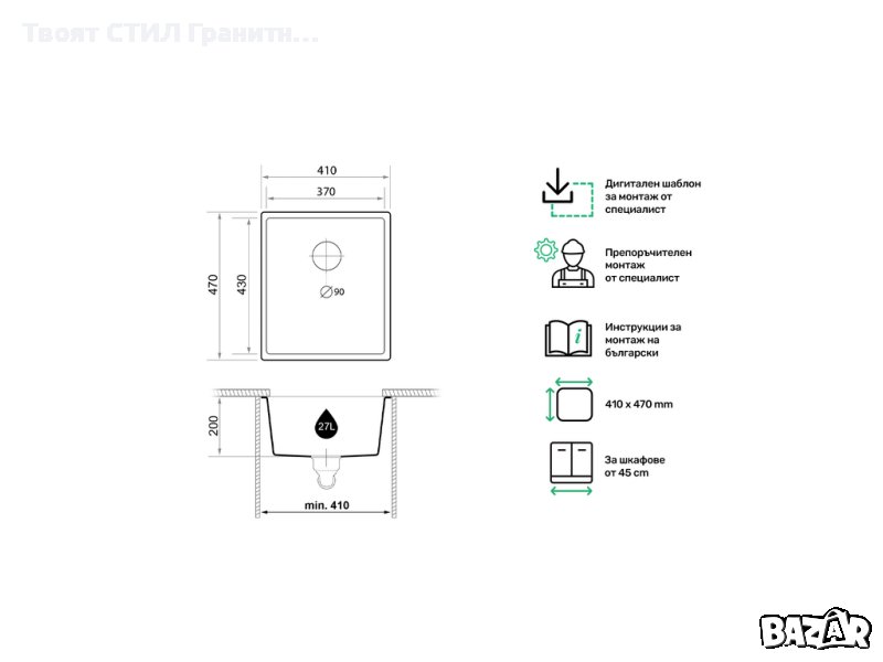 Основна информация за модела кухненска мивка Лондон 45 410x470