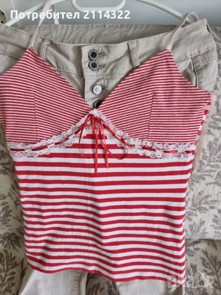 Горната част е на Nia & Dorado, с рози. Стилно и интересно, в меки, светли и пастелни цветове в комбинация с червено. Много приятен за лятото. Размер М. Продавам, защото ми е малък.