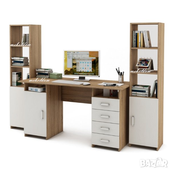 Бюро 143см. с 4 чекмеджета,врата и 2 етажерки с плавни врати(код-0919) цветове-Дъб Сонома+Бяло,Венге+Дъб,ВЕНГЕ,Млечен дъб,ОРЕХ,БУК,Дъб Сонома,Светло сиво или БЯЛО