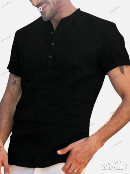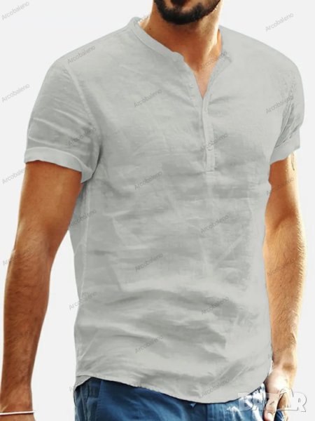 Мъжка памучно-ленена риза с V-образно деколте и къси ръкави, 6цвята