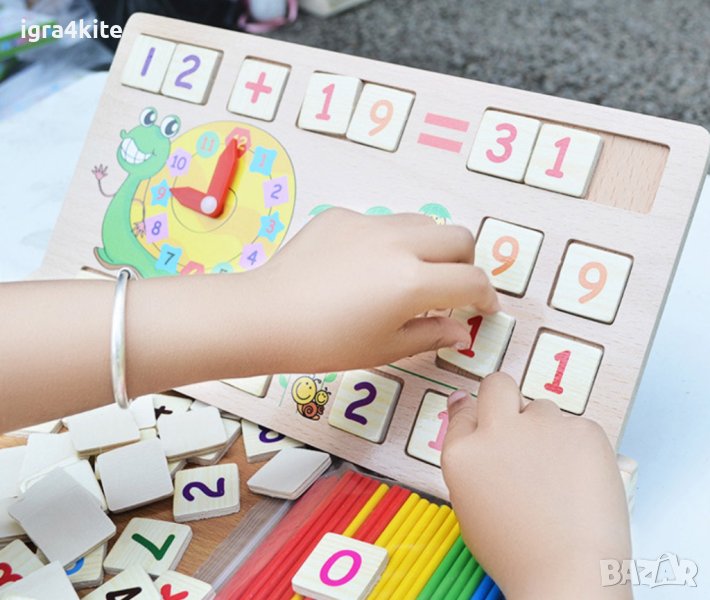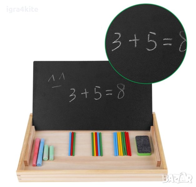 Дървена двустранна дъска с математика пръчици и часовник