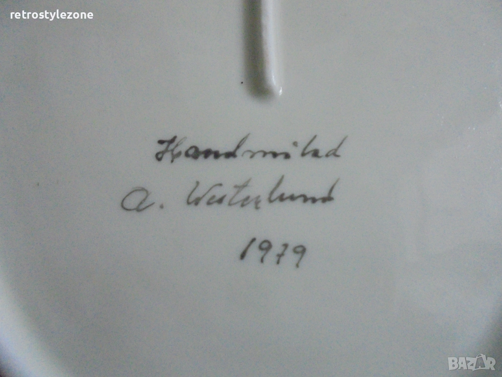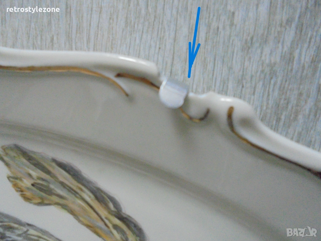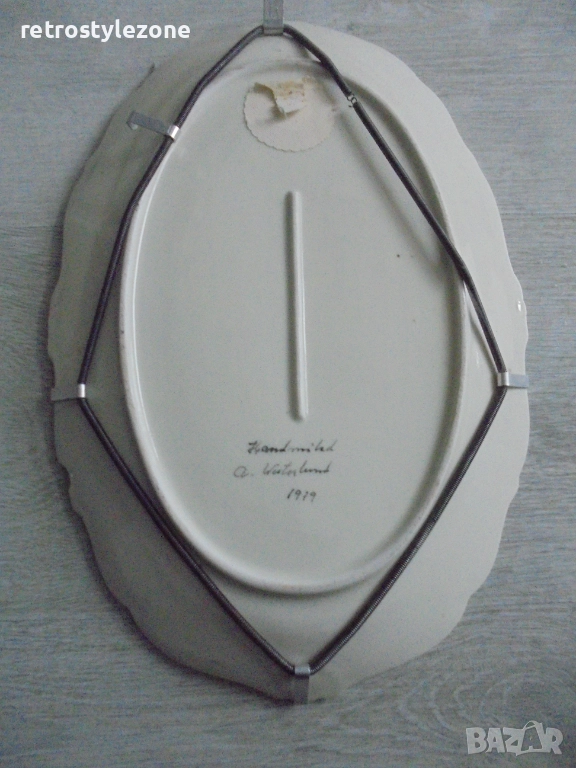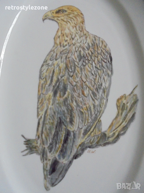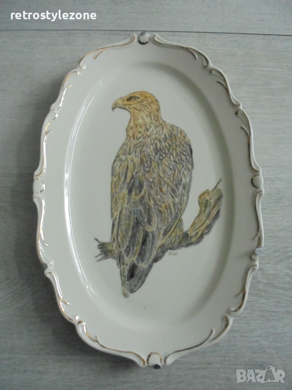 Красиво ретро порцеланово пано, произведено през 1979 г., с фина елипсовидна форма и ръчно нанесена художествена декорация – изобразена е величествена граблива птица, изпълнена с внимание към детайла и естествените тонове. Пано, което носи духа на миналото и е подходящо както за колекционери, така и за ценители на винтидж интериор.