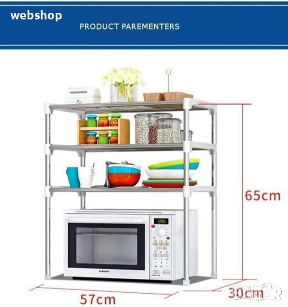 Снабдете се с нова придобивка в кухнята си. Бъдете организирани и съхраняване всичко на удобно и практично място. Днес вече на пазара можете да намерите безброй много органайзери, кутии и принадлежности за дома, които да си осигурят максимално удобство, дори и в по-малки помещения. Затова днес сме ви приготвили една от тези принадлежности, които ще улесни и направи кухнята ви удобна за пребиваване. Тов е етажерката с три рафта, подходяща за използване над микровълнова печка. Лесен и бърз монтаж, лека на тегло.