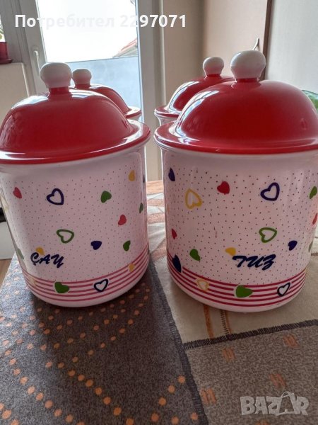 Пластмасов,свеж комплект за съхранение на подправки,състоящ се от 9 съдчета, 4 по-големи и 5 малки. Размерите са посочени на снимките. Съдовете нямат пукнато или счупено,всичките са със здрави капачета.