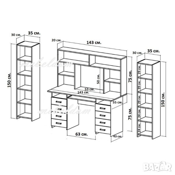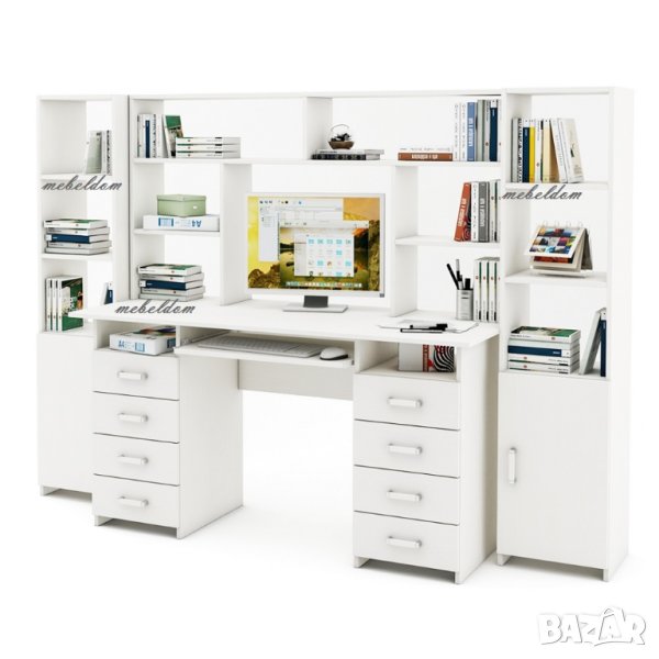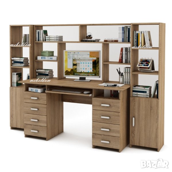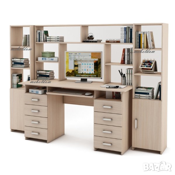 Бюро 143см. с надстройка,8 чекмеджета,клавиатура и 2 етажерки с плавни врати(код-0926)