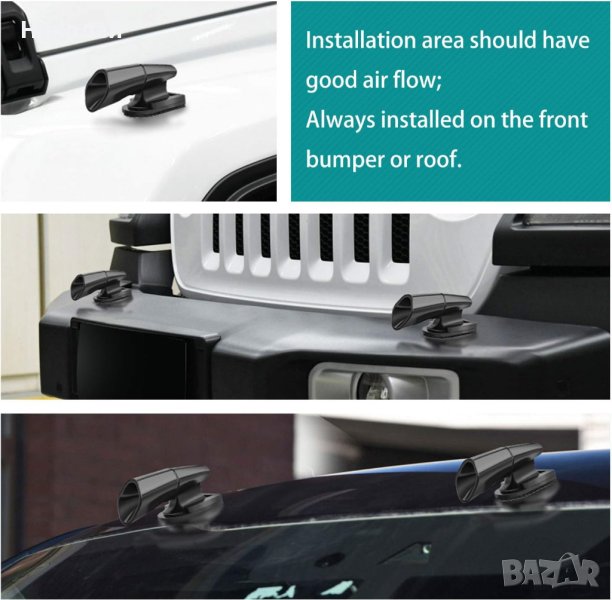 Система за подаване на звуков сигнал при движение на автомобила със скорост над 60км/ч. Работи използвайки въздушен поток от движеща се кола. Този артикул е създаден да издава необичаен, но ефективен звук, звукът, който може да се чуе от животни и да ги прогони встрани от пътя, като по този начин да ви предпази от сблъсък с тях. Може да се монтира в предната част на решетката. комплекта включва 2бр.