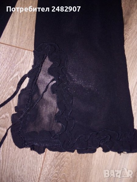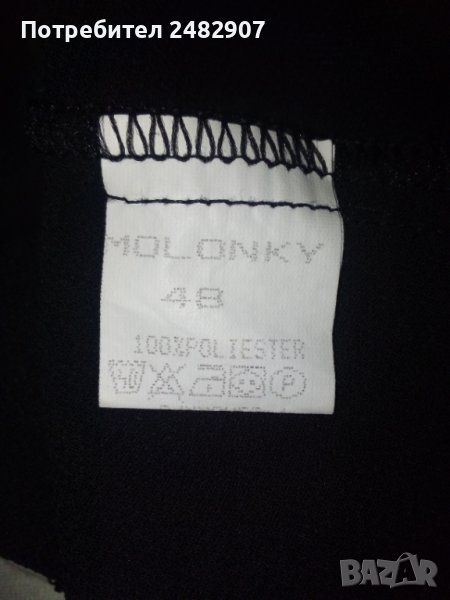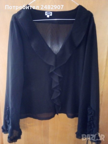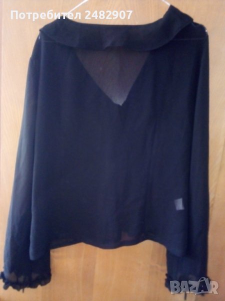Елегантна дамска блуза в черно, размер 48. Съдържа 100 % полиестер, къдри и връзки в долната част на ръкавите. Закопчаване - с частичен скрит цип от лявата страна. Ширина в раменете - 47 см, ширина под мишниците - 55 см, дължина от рамото до долу - 57 см, ширина в долната част - 54 см, дължина на ръкава от рамото - 60 см. Много запазена, почти не е използвана, без забележки, с малки цепки отстрани в долната част и прозрачен ефект.