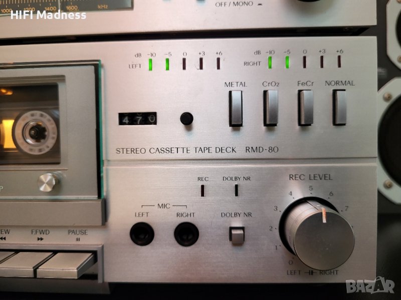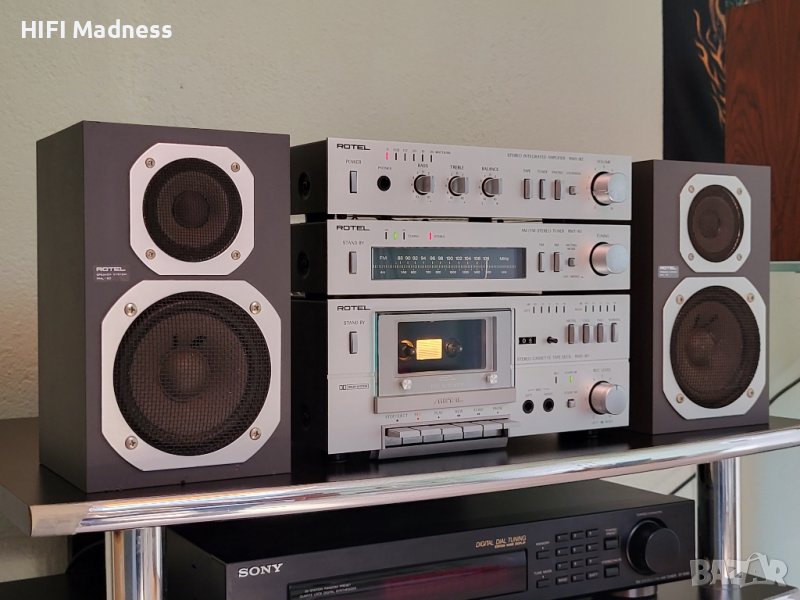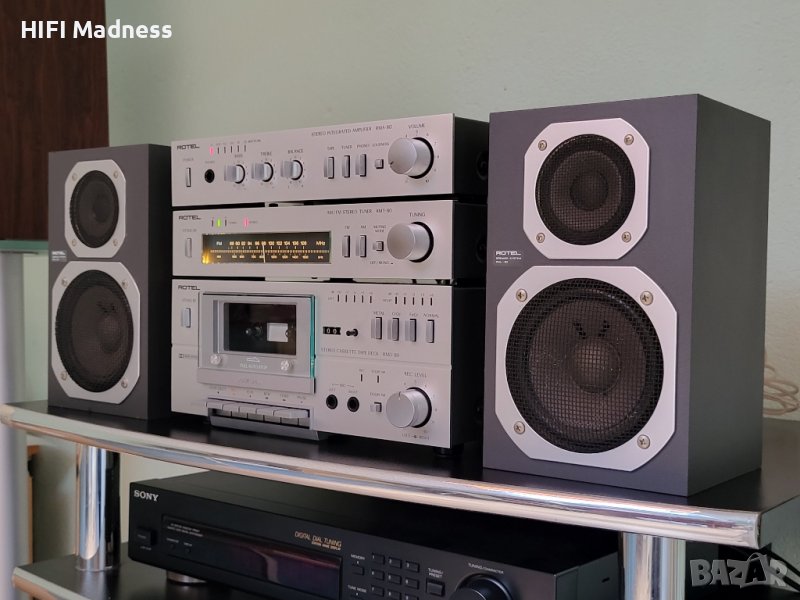 Качествена винтидж стерео система от отделни компоненти Rotel, състояща се от FM стерео тунер RMT-80, Стерео касетен дек RMD-80, Стерео интегриран усилвател RMA-80 и