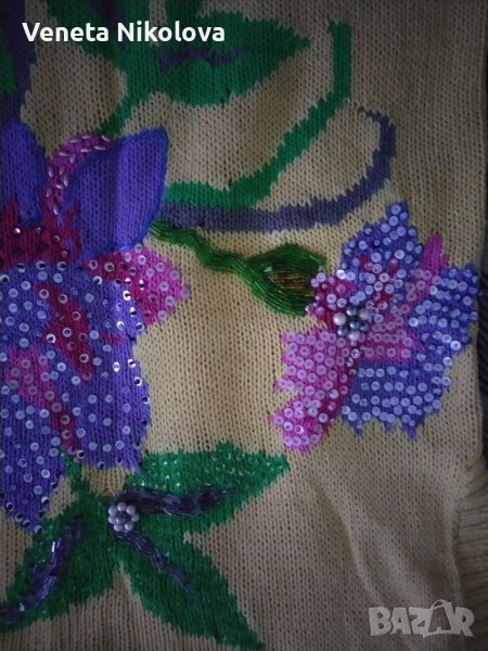 Плетена блуза с оригинални цветни апликации от пайети, перлички и мъниста. 100о/о полиакрил. Дължина 75 см.