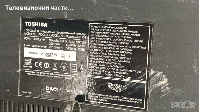 Toshiba 40TL938 със счупен екран-V71A00022901/PE1091 V28A001434C1/12PSQBC4LV0.0/LTA400HV04