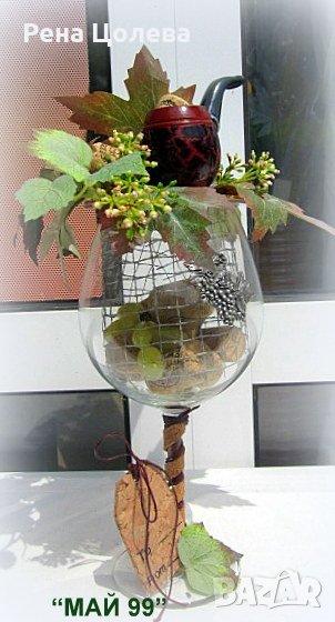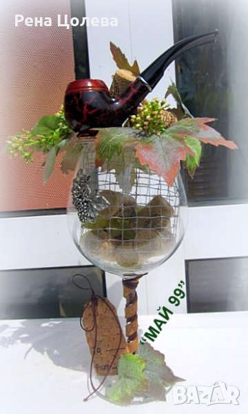Оригинален мъжки подарък за ценители на хубавото вино - чаша за вино украсена с елемент /сплав от калай и сребро във формата на грозд/,коркови тапи/вътре и отгоре/лозови листа и чудесна пура за декорация! Височина 32 см.