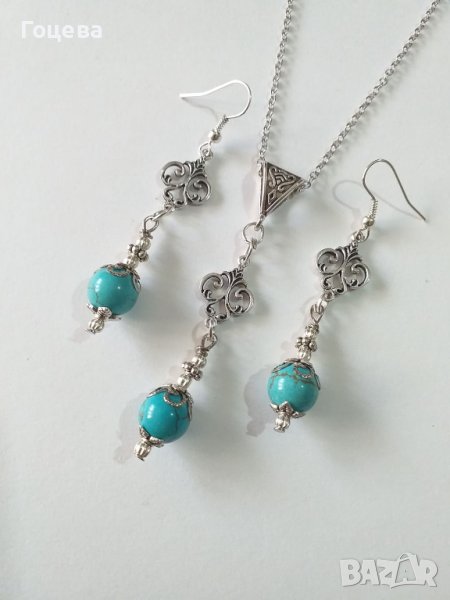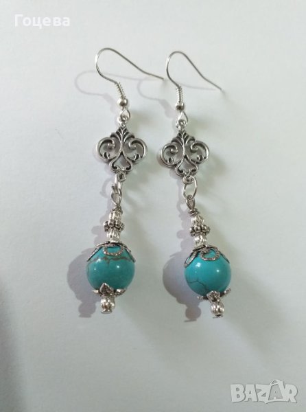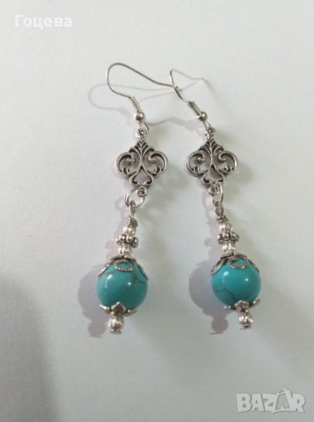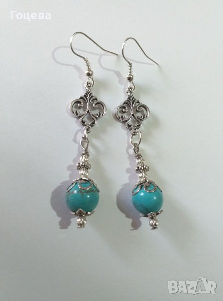 Красиви обици с естествени Тюркоази. Красиви и елегантни обици с естествени Тюркоази. Авторски дизайн. Ръчна изработка. Цена на обеците - 21 лв.Има и комплект от този модел. Може да се направи и гривна към комплекта. Цена на комплекта обеци и колие - 30 лв. Цена на гривната - 18 лв. За поръчка на лично съобщение Доставка до всяка точка на България и света