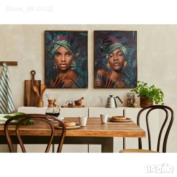 Красивата екзотика струи на тюркоазени вълни от тази картина, която одухотворява, внася динамика и естествено присъствие! Портретът на младата жена с цветен тюрбан на главата е заобиколен от палмови листа и съчетава натуралната естетика с магнетизма на природата.