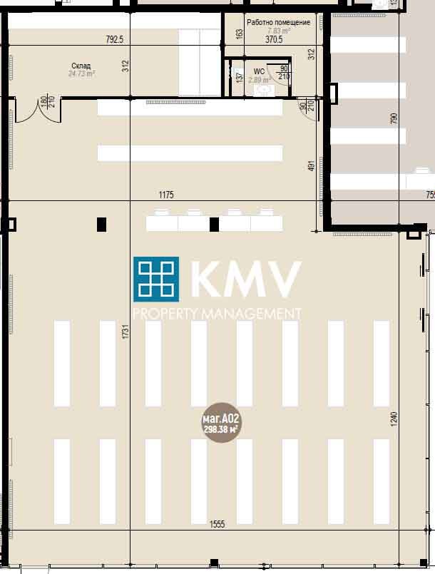Магазинът, който Ви предлагаме се намира на партерен етаж, със застроена площ 298,38 кв.м. Разпределението на помещенията е, както следва: търговска зала, работно помещение, тоалетна и склад. Има възможност за покупка на външни паркоместа пред самия магазин. На партерно ниво на сградата се помещават общо 5 търговски обекта.