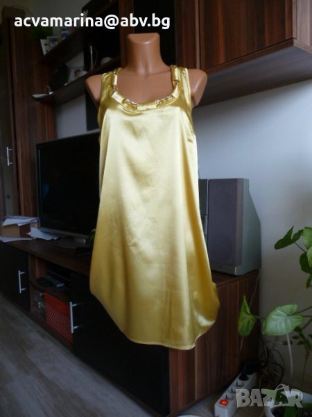 Елегантна свободна рокля от сатен с ефекти на деколтето . В действителност е по- наситено жълто . Дължина от рамото до долу-92 см,бюст-100 см, талия -100 см , ханш 108 см