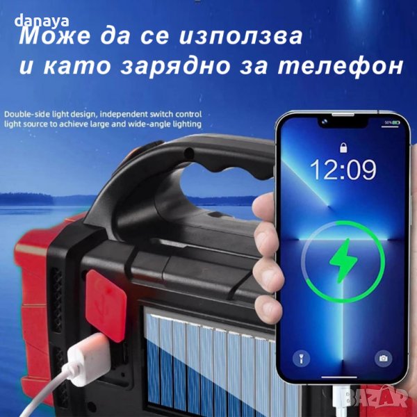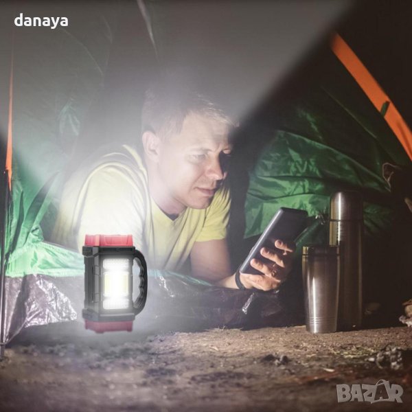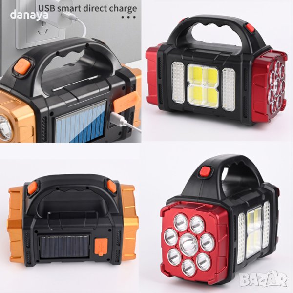 Супер мощен къмпинг фенер с насочена светлина – оранжева/бяла светлина и странична светлина-тип настолна лампа. Подходящ за охрана на обекти, или за къмпинг излети, за домашно ползване и изобщо навсякъде, където е нужна светлина. Зареждането на фенера е чрез USB кабел от комплекта или със слънчево зареждане, чрез вграденият соларен панел. Фенерът може да се използва и като Power Bank.