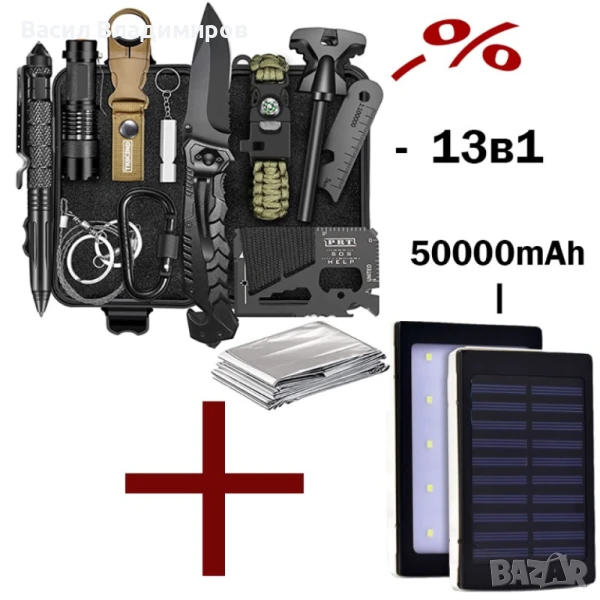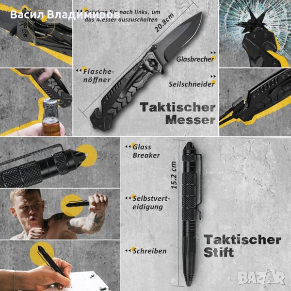 Обичате ли къмпинга сред природата и приключенията? С този компелект за оцеляване сте оптимално оборудвани във всяка ситуация. Можете да вземете целия комплект със себе си или да изберете няколко инструмента, от които се нуждаете, за да изживеете приключения на открито или дейности сред природата като туризъм, къмпинг или скално катерене