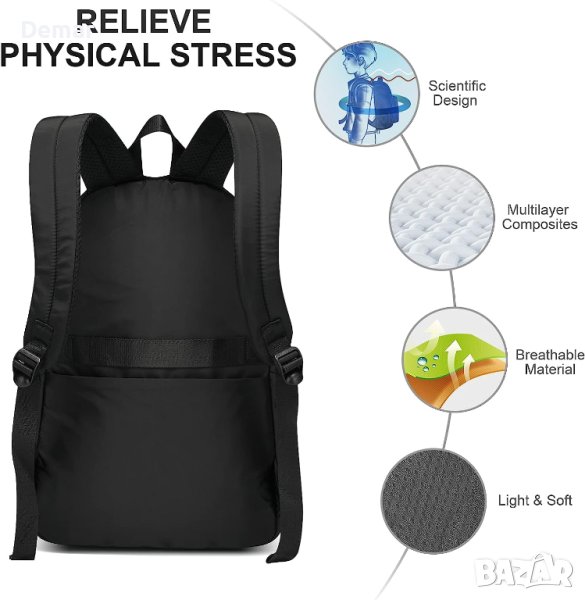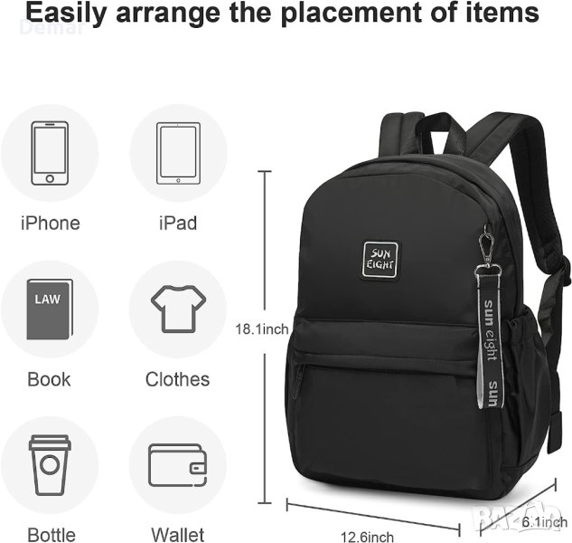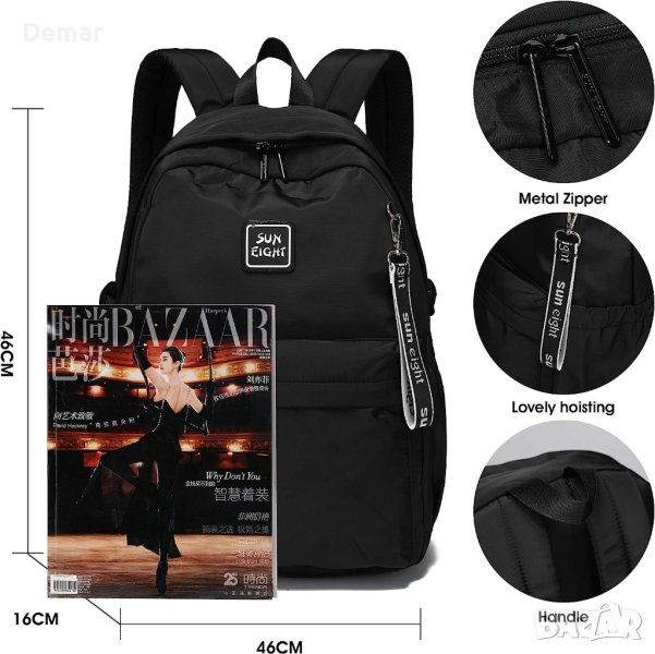 Размерът на ученическата раница е 46*32*15см. Има 1 основен джоб, 1 преден джоб и 2 странични джоба, можете лесно да поставите в папки, книги, лаптопи, таблети, дрехи, закуски и др. Две странични чанти могат да съхраняват бутилки с вода и чадъри. Има и джоб с цип на гърба, който може да съхранява лични продукти като банкови карти, портфейли, ключове. Научните и разумни дизайни на джобове и прегради могат да поставят ежедневните нужди в чантата по подреден начин.