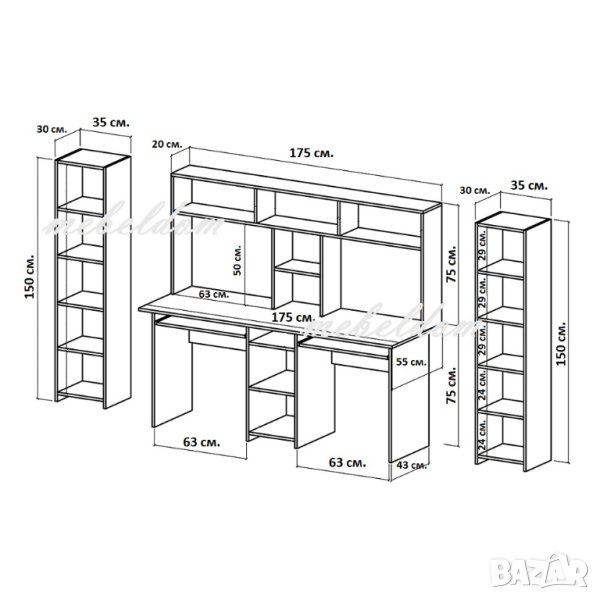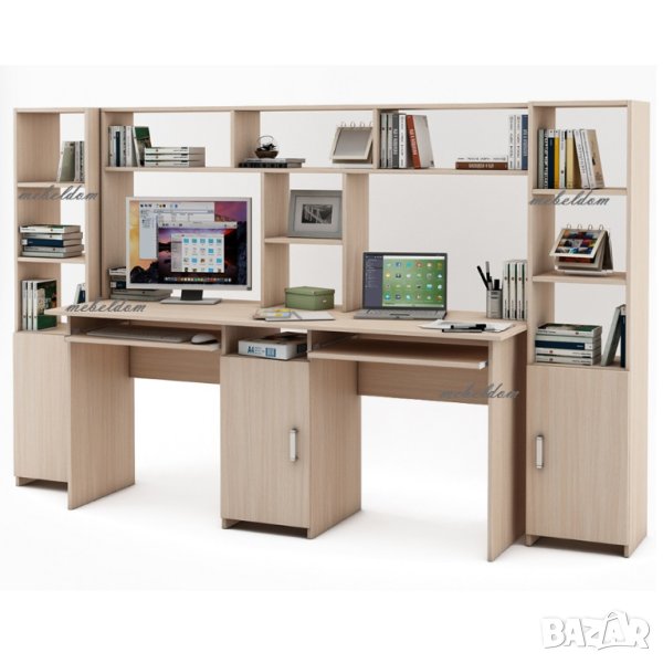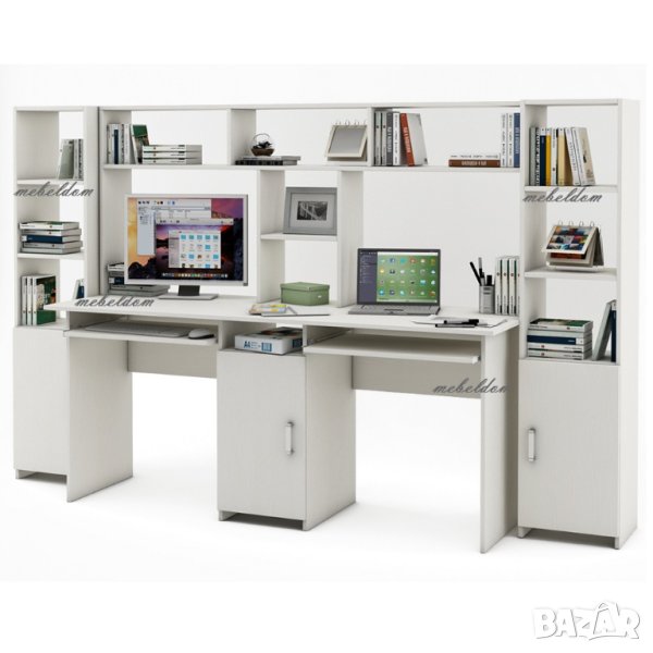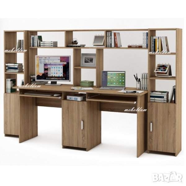 Бюро 175см. с надстройка за двама с 2 клавиатури и 2 етажерки с плавни врати(код-0930) цветове-Дъб Сонома+Бяло,Венге+Дъб,ВЕНГЕ,Млечен дъб,ОРЕХ,БУК,Дъб Сонома,Светло сиво или БЯЛО