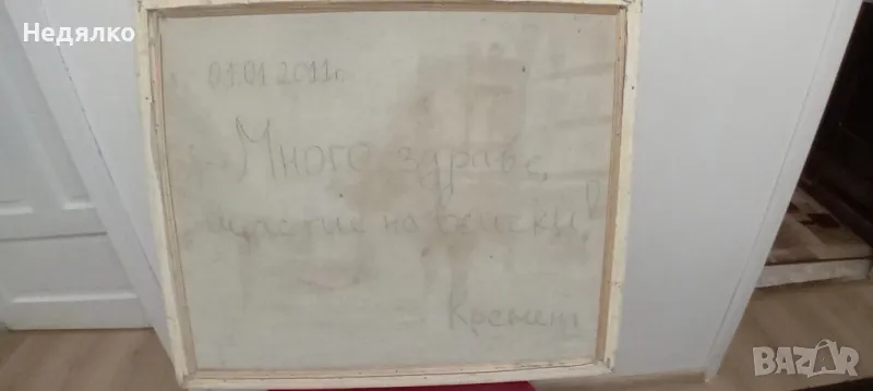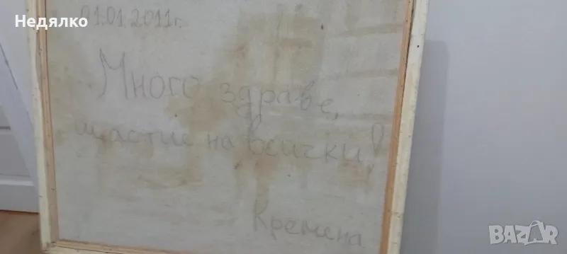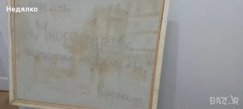 Голяма,отзад с послание за подарък,подписана на гърба,видно,около 65х55 см с рамка,ще дам точните размери, при интерес.