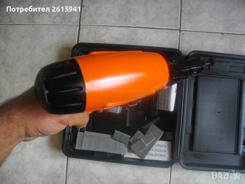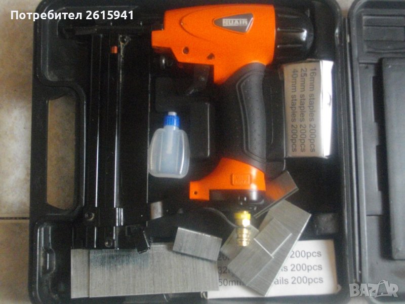 В куфара към машината има масльонка, 1 бр. кутия със различни размери кламери скоби 16-40 мм, 1 бр. кутия с пирони дърводелски различни 16-50 мм.