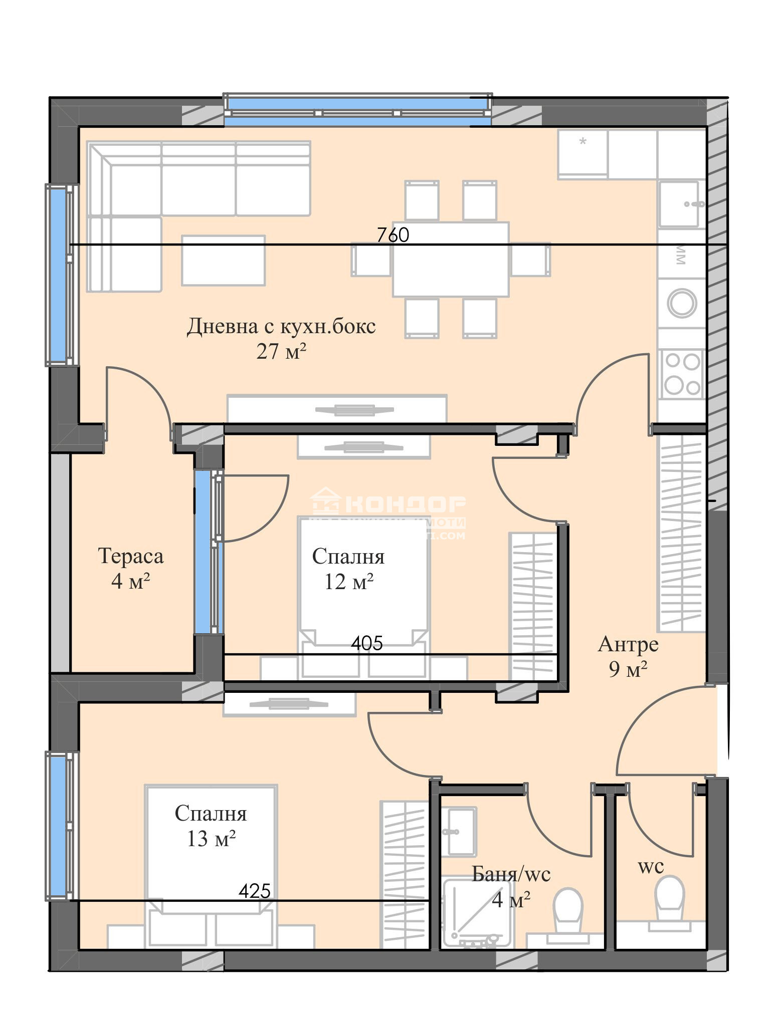 Разпределения - Просторни и много функционални апартаменти с просторни стаи и гледка към Стара планина, а също и с партерни жилища с двор и такива с големи панорамни тераси. Апартаментът, който Ви предлагаме се състои от ъглова дневна 27кв.м. с кухненски бокс и трапезария, две самостоятелни спални 12 и 13кв.м., баня с тоалетна, втори санитарен възел, входно антре с място за гардероб и една тераса.