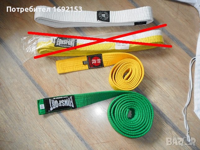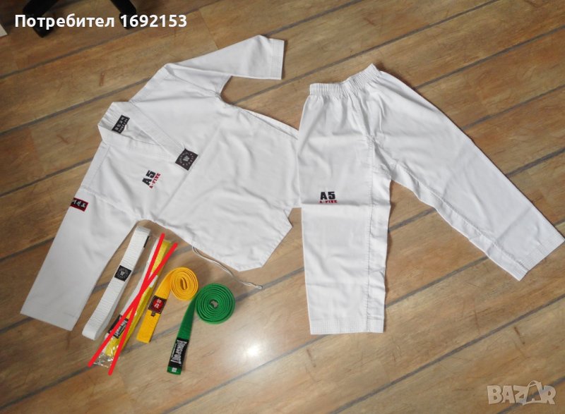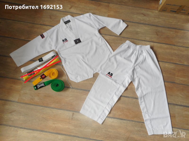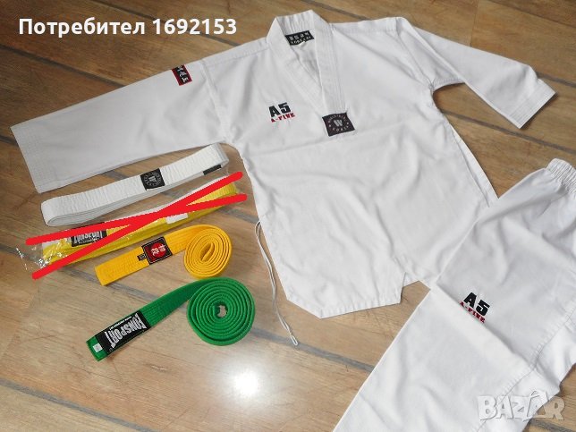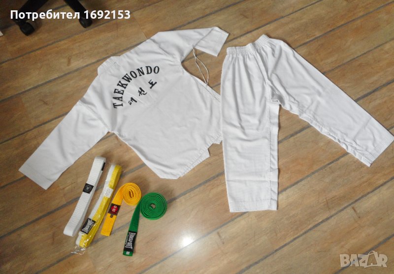 Екипът включва : горнище, долнище и бял колан с дължина 156 см. Цена 35 лв.