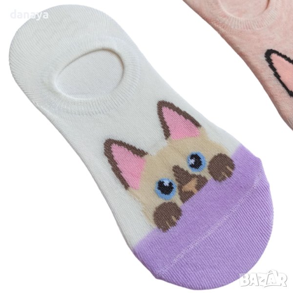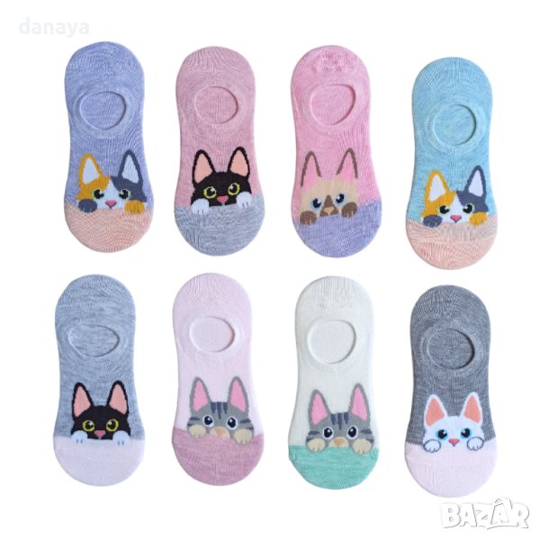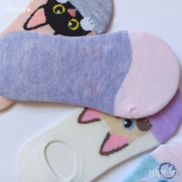 Памучни детски чорапи тип терлик в много нежни цветове и надничащи котета. Чорапите са памучни, меки, еластични и много приятни на допир. Подходящи са за деца на 7-8 годишна възраст.