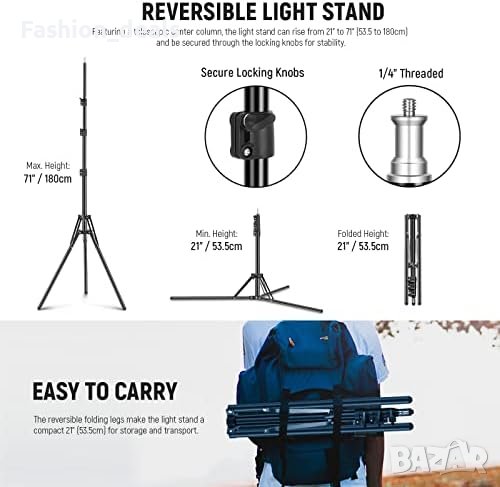 стойка за светлина с регулируема височина от 21" до 71" (53,5 до 180 см).