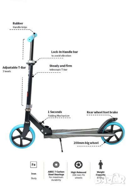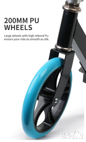 Висококачествена луксозна, алуминиева тротинетка с големи гуми 200мм с които можете да преминете леко през препядствия, при които други троринетки биха се затруднили или спрели. С големите гуми 20см получавате по-добро набиране на скорост, бързо спиране и по-комфортно возене..