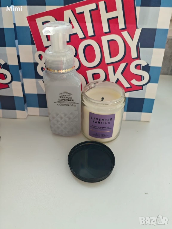 -Комплект French Lavender- течен сапун-пяна за ръце, с помпичка,, пъпеш, къпина, виолетови листа и мандарина; средните нотки са лавандула, нектарин, момина сълза и жасмин; базовите нотки са мед, мускус и дъб, 259мл + средна свещ същия аромат 45 лв, (подарък ми е компекта, но не е моето палила съм я един път, за да я помириша както се вижда на снимката е цяла.