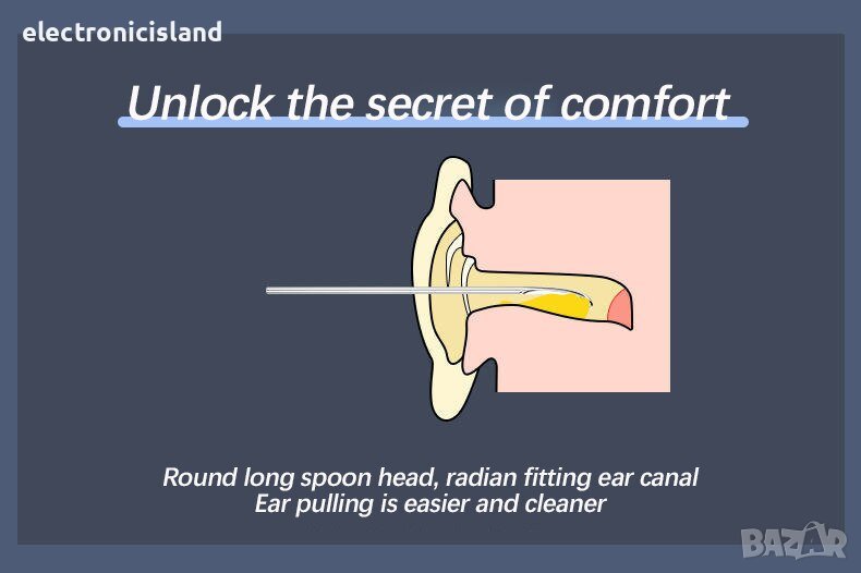 - Включва накрайник със спирален жлеб, който може да достигне идеалното разстояние от ухото и ефективно да отстрани ушната кал.