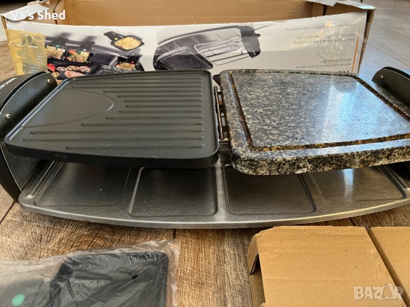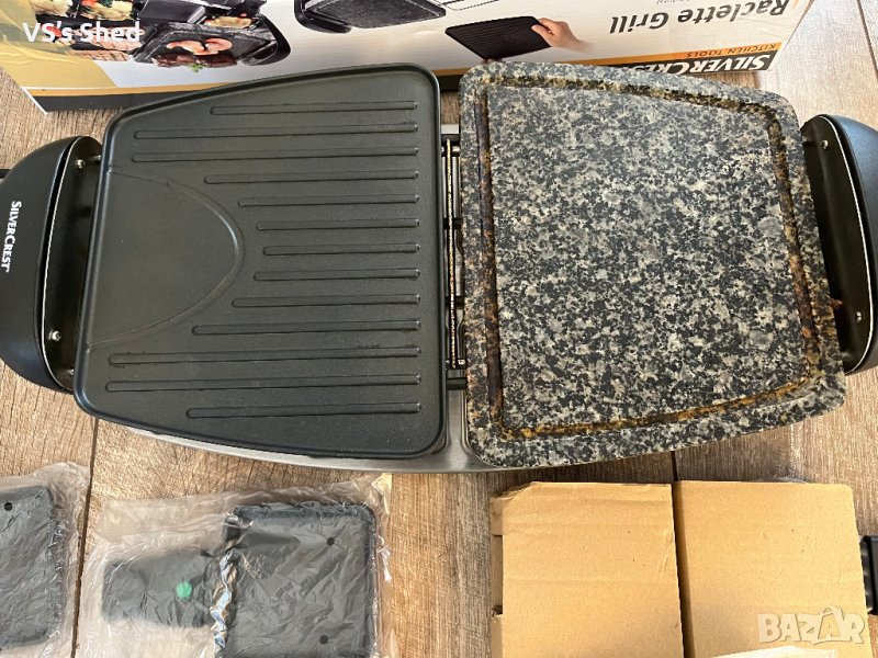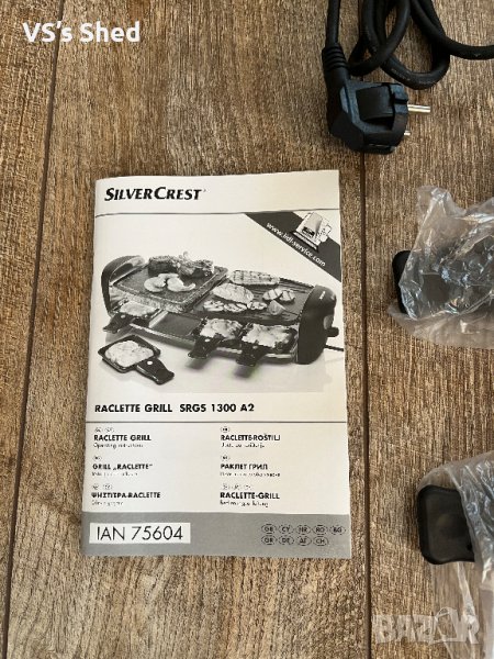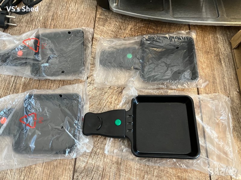 Silver Crest грил използван няколко пъти и в отлично състояние. 4 от малките "тавички" са използвани, но без следи от употреба. Останалите 4 и дървените шпатулки са чисто нови.