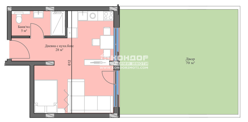 Разпределения - Просторни и много функционални апартаменти с просторни стаи и гледка към Стара планина, а също и с партерни жилища с двор и такива с големи панорамни тераси. Апартаментът, който Ви предлагаме е с изцяло източно изложение и се състои от едно просторно помещение с реална възможност да бъде отделена спалня, баня с тоалетна и собствен двор 70кв.м.