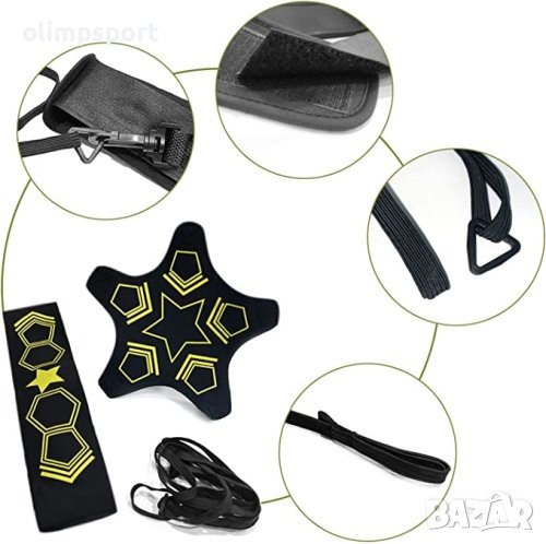 Комплект ластик с колан за самостоятелна тренировка по футбол. Обхваща голяма площ от топката с цел предотвратяване измъкването и по време на употреба. Отлично пособие за подобряване на умения като контрол над топката, подаване, удар, първо докосване и скорост на реакцията. Предоставя възможност за уплътняване на времето за тренировка, тъй като не се налага трениращият да гони топката по терена. Подходящ за употреба от деца, юноши и възрастни. Регулируем колан за кръст, чиято обиколка може да бъде променяна посредством велкро лепенка до 90 см. Подходящ за – топки с размери от 3 до 5. Дължина ластик неразтегнат - от 110 до 200 см. Материал – неопрен, полиестер, PVC. Тегло – 110 г. Цвят – черен. ВНИМАНИЕ! Комплектът не включва топка. Снимката е с илюстративна цел.