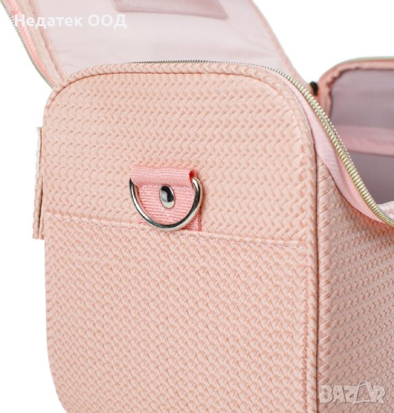 Розова плетена тоалетна чанта с голямо пространство, огледало и ластични джобове. Освен това има презрамка за закачане през рамо, златен метален цип с висящи пискюли и твърда дръжка.