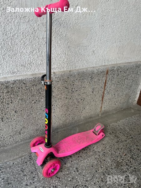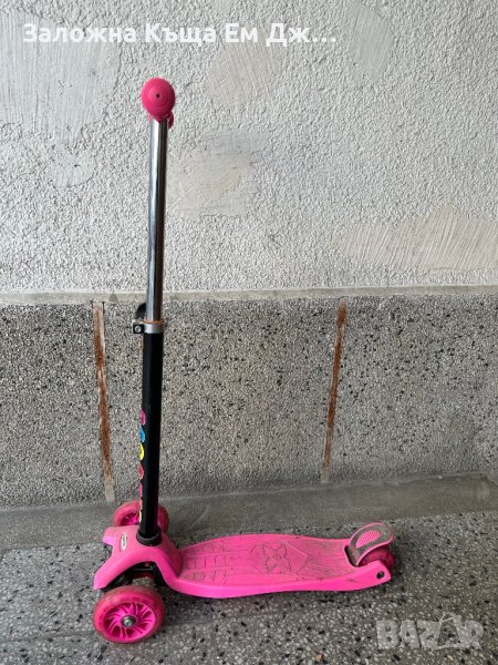 Перфектно състояние със светещи гуми. Подходяща за деца до 60кг. Тротинетка Scooter с три колела и регулируема височина на кормилото. Има задна крачна спирачка. Завива с накланяне на кормилото. Кормилото се регулира от височина 65 см до 90 см. Колелата са от полиуретан, с размер 12 см - двете предни, и 8 см - задното. Палубата е с размери 39 см х 13 см, покрита с нехлъзгаща повърхност.