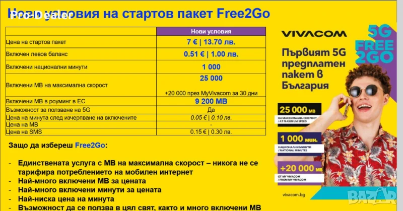 Пакет Free2Go запазва същата цена, но вече ще се предлага с 25000 MB на максимална скорост и 0,51 € включен баланс