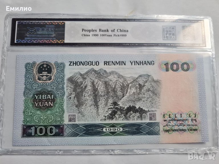 100 Юана от 1990 год. Банкнотата е Сертифицирана от Китайска Фирма за Оценка на Състезанието на Банкноти