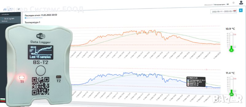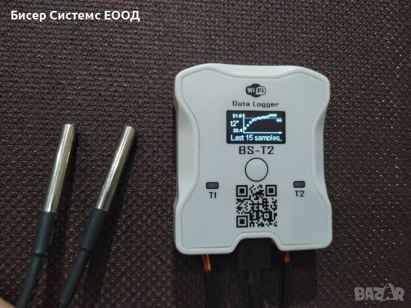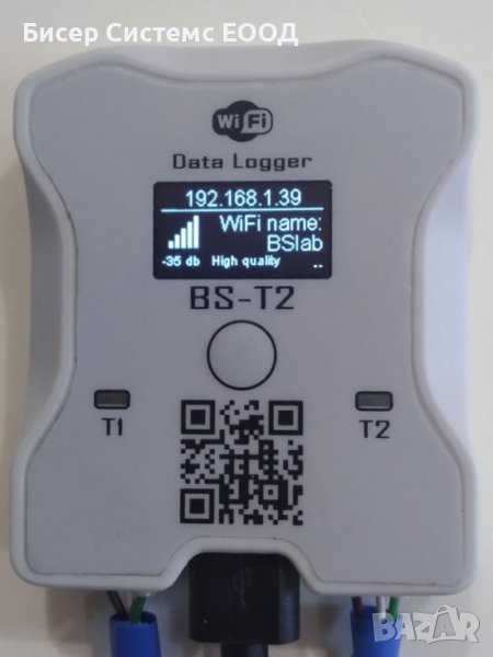 BS-t2 WiFi е миниатюрен контролер в елегантна кутия за закрепване на стена. Измерва, визуализира и записва температура от два цифрови датчика на кабел с дължина до 30 метра. Алармира с двуцветни LED и звук за достигнати горна или долна граница, настроени от клиента.