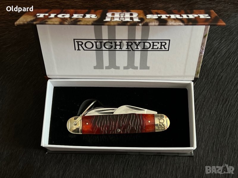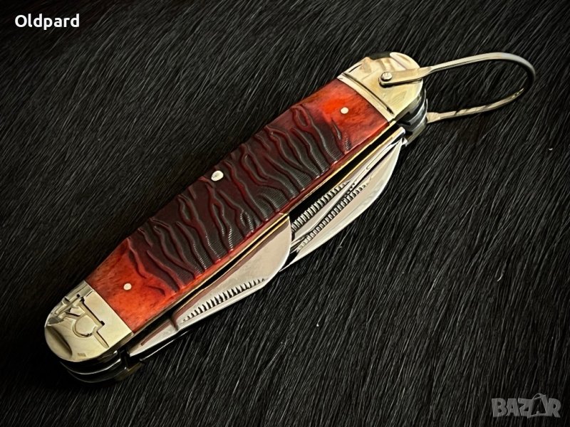 Сгъваем колекционерски ловен нож (Tiger Stripe).Надежден нож с четири полирано остриета. Дръжка с наслагвания от специално обработена кост. Винтидж колекция. Ограничена серия. Кутия за подарък.. Дължина на острието 8,0 см. Дължина на сгънат нож 11 см. Това е прекрасен подарък за мъж за всякакви празнични поводи.