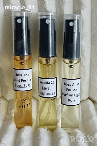 18/ "Boss Alive Eau de Parfum" - Hugo Boss – 15 мл. в изпълнение на Заг Зодиак. Носи „вайба“ на Good Girl, но е по– свеж и ярък. Траен и наситен. Цена 7 лв.