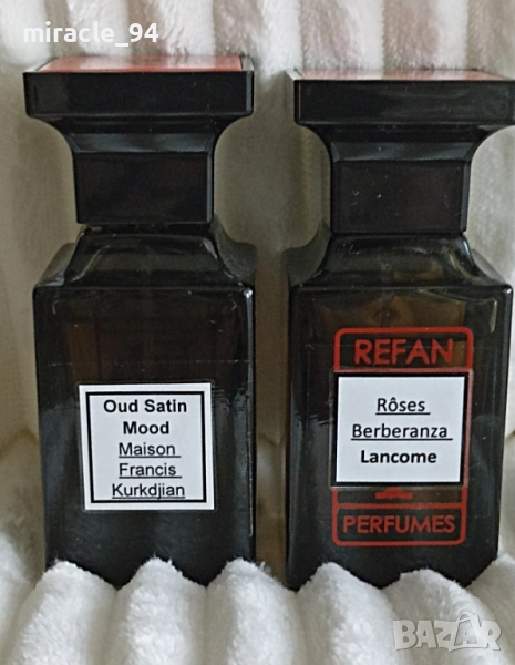 12/ “Oud Satin Mood" Maison Francis Kurkdjian – в изпълнение на Рефан, без кутийката си. 48/50 мл. Уд и роза, изключителна трайност, над 8 часа, унисекс. Цена – 19 лв.