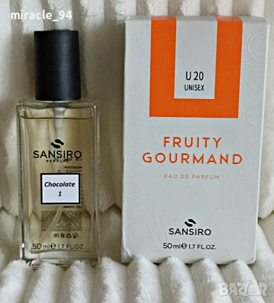6/ “Chocolate 1“ - в изпълнение на San Siro – 50 мл. - с кутийката си, пръснат за тест. Вкусен унисекс аромат на шоколад, мандарина и КАКАО. Много добра трайност, подходящ е за по- хладно време. Цена 12 лв.