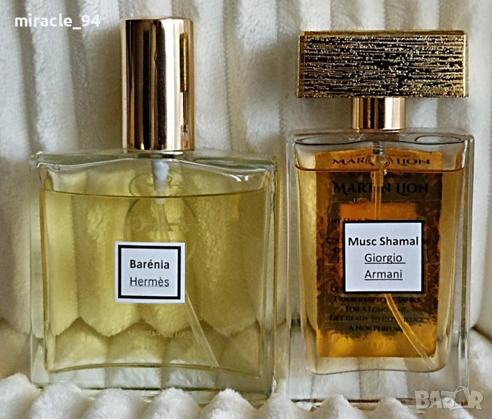 13/ "Musc Shamal" - Giorgio Armani – в изпълнение на Мартин Лайън. Налични 45 от 50 мл. УНИСЕКС парфюм. Техническите показатели са на висота, а самият аромат е точно на ръба между дамски и мъжки. Аз усещам алдехидни /сапунени/ нотки и нотки на теменужка. Усещат се и амбра и дървесни нотки. Ароматът пулсира. Наистина е страхотен за любителите на това направление. Цена – 15 лв.