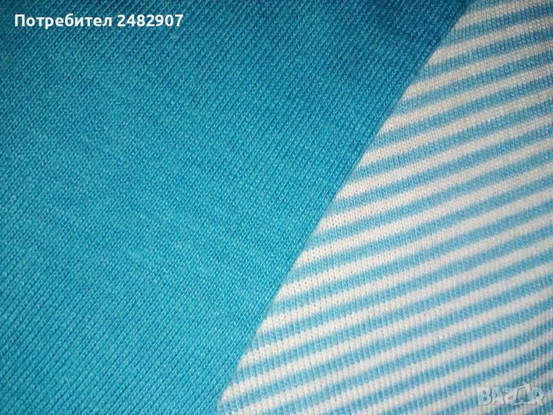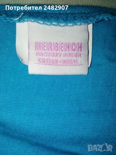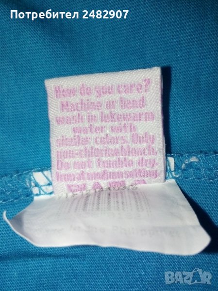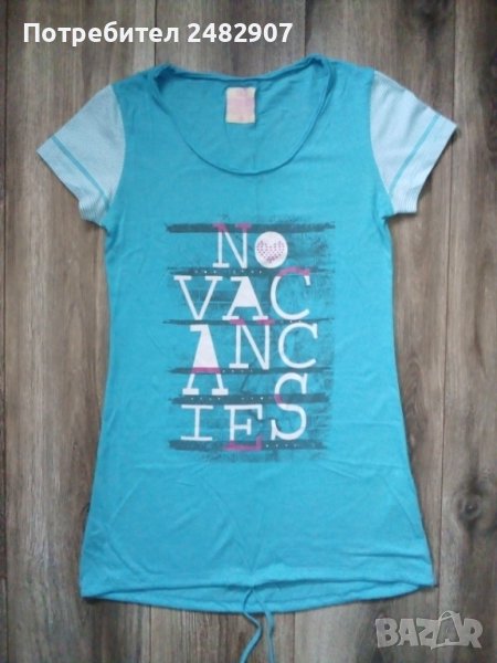 Светлосиня дамска туника с връзки, къс ръкав и надпис, размер S. Ширина в раменете - 36 см, ширина под мишниците - 42 см, ширина в долната част - 50 см, дължина от рамото до долу - 72 см, дължина на ръкава от рамото - 13,5 см. Много запазена, почти не е използвана, без забележки.