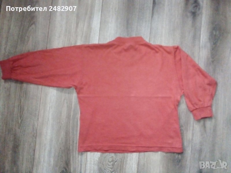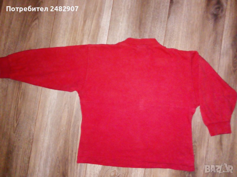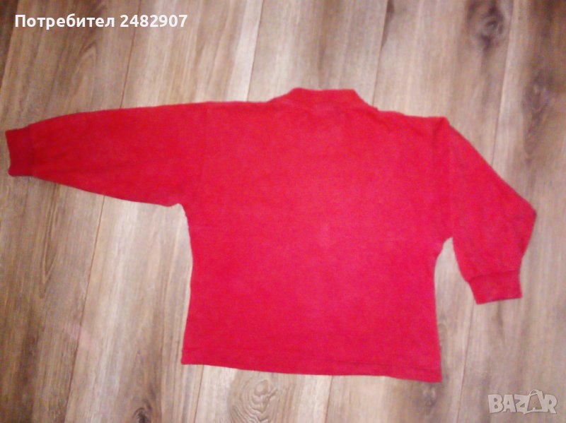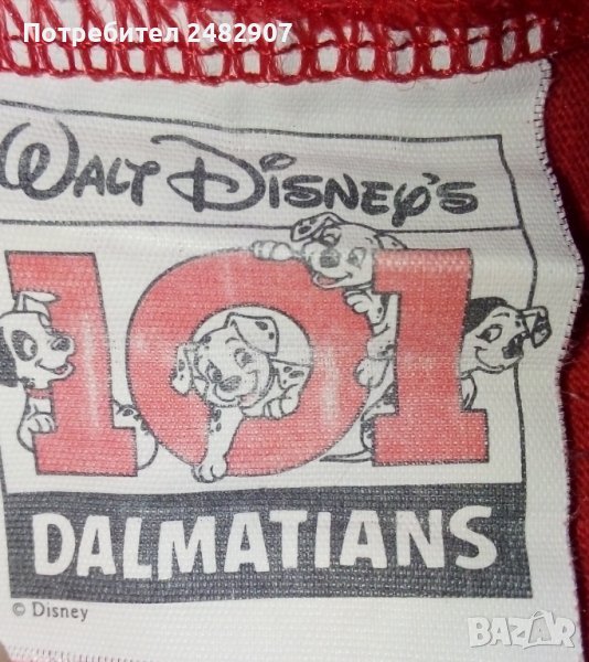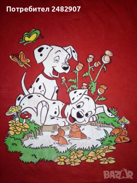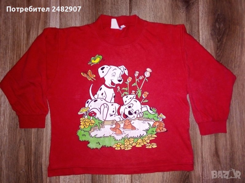 Червена детска блуза с далматинци за ръст 98-104 см. Ширина в раменете - 37 см, ширина под мишниците - 42 см, дължина от рамото до долу - 41,5 см, дължина на ръкава от рамото - 32 см. Запазена, с нормални следи от износване.