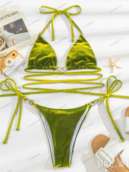 Секси бикини с дълга талия с презрамки и метални обръчи от кадифена материя. Моля, използвайте таблицата с размери, показана на снимките. Преди да изберете размер, моля, прочетете внимателно всеки елемент от таблицата с размери. Уникален дизайн, класически стил, ежедневен и удобен. Подходящ е за излизане и свободно време. Размерът се измерва ръчно и грешката от 1-3 см е нормална.