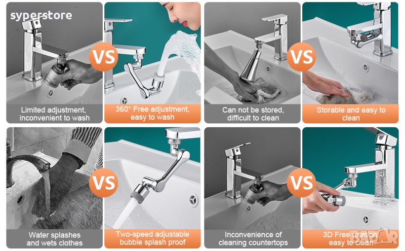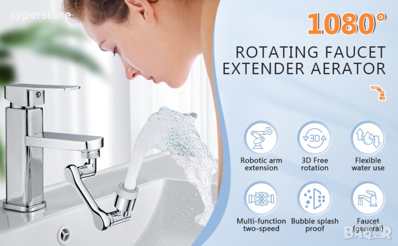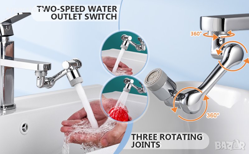 Удължителят може да се завърти на 1080 градуса и може лесно да се фиксира или сгъва по желание, така че водният поток да може да достигне всеки ъгъл на мивката за лесно почистване.